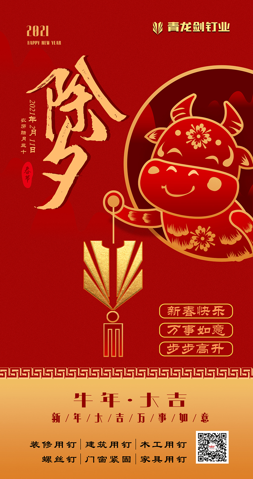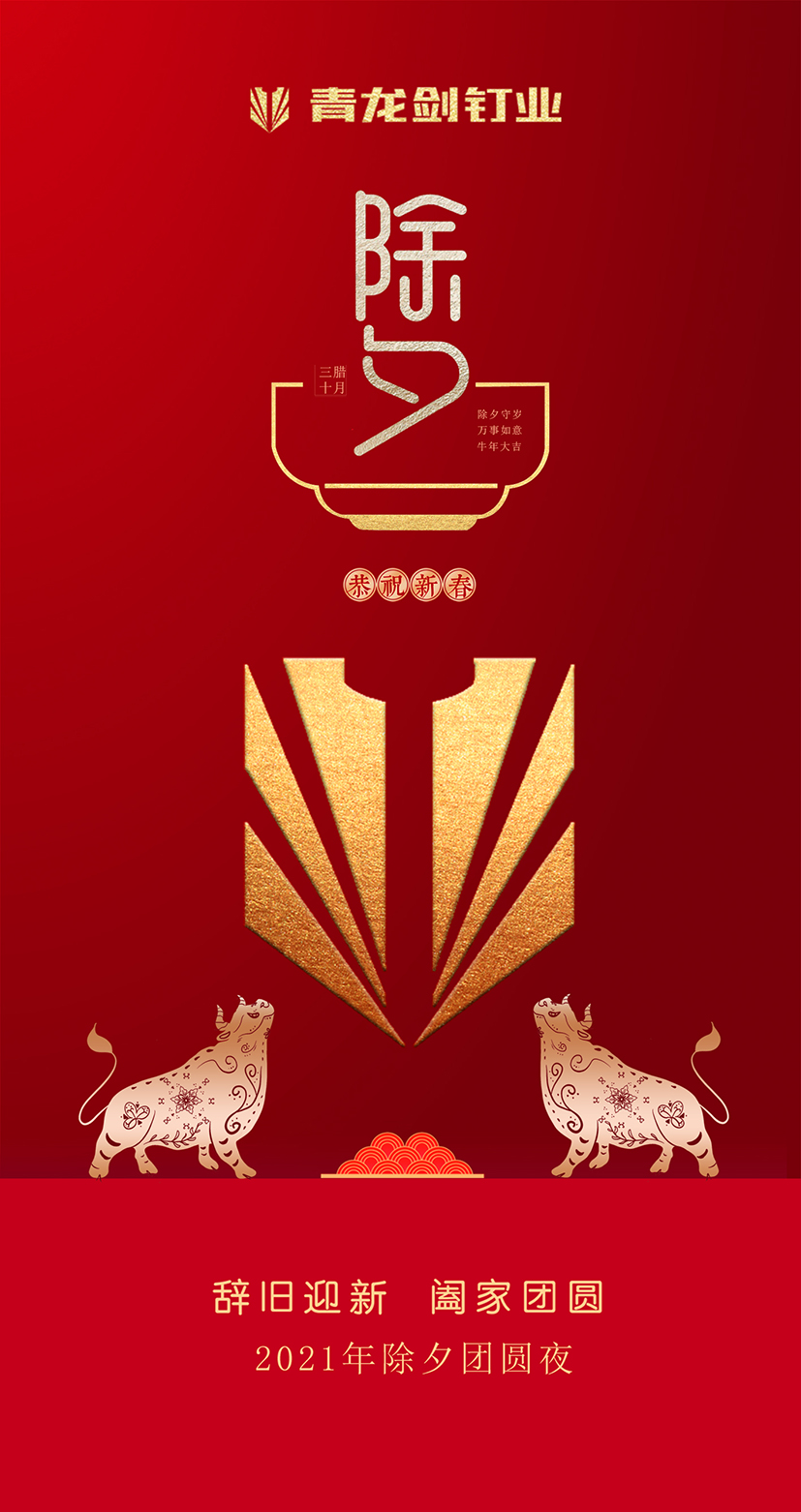 長河悠遠(yuǎn),天地常新。2021年新春的曙光即將開啟時間之門,在這辭舊迎新的美好時刻,我們向關(guān)心和支持青龍劍公司發(fā)展的社會各界同仁、全國的經(jīng)銷商、供應(yīng)商和用戶朋友們致以親切的節(jié)日問候和誠摯的新春祝福!向奮斗在一線工作崗位、勤勉敬業(yè)的青龍劍員工致敬!
