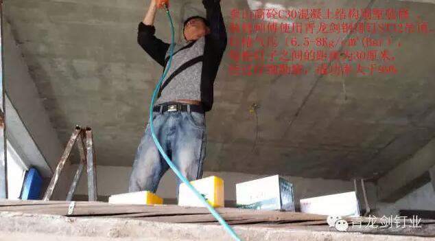 近期青龍劍釘業技術人員和銷售人員對青龍劍產品終端用戶進行了走訪調研。 調研結果如下: 裝修工程隊使用青龍劍鋼排釘ST32對使用奎山商砼C30混凝土結構的別墅進行裝修吊頂 。(C[詳情] 2016-06-22 12:29:17